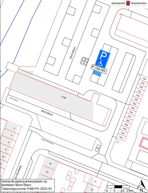 Burgemeester en wethouders van Amstelveen besluiten het parkeren te verbieden op een parkeerplaats in de straat Mont Blanc, zoals aangegeven op tekening PAB-PV-2025-03, met uitzondering van het voertuig met het kenteken P-156-RH (gehandicaptenparkeerplaats).