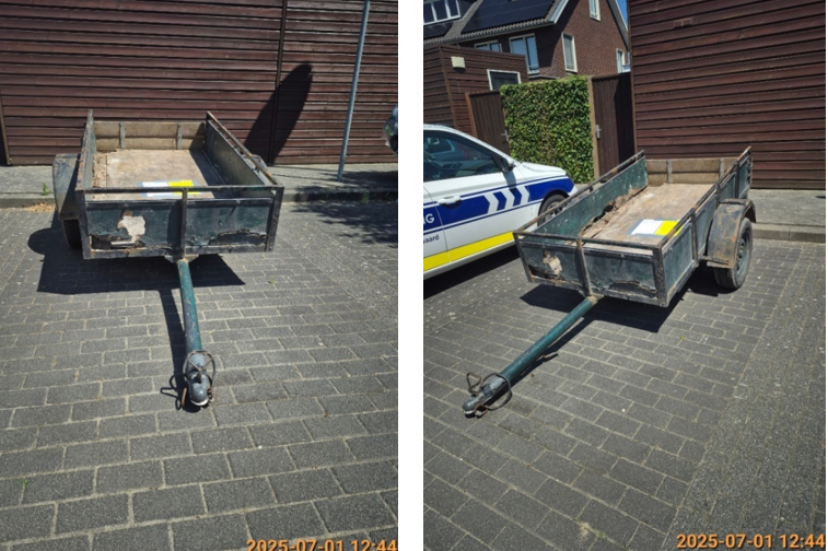 De aanhangwagen is geconstateerd op 17 juni 2025 aan de Legionairsplaats, ter hoogte van de achterzijde van Tribunusallee 15 en 17 in Huissen. Wij zijn voornemens om de aanhangwagen weg te slepen op grond van artikel 5:6 van de Algemene plaatselijke verordening gemeente Lingewaard 2025. De eigenaar van de aanhangwagen kan niet worden achterhaald.