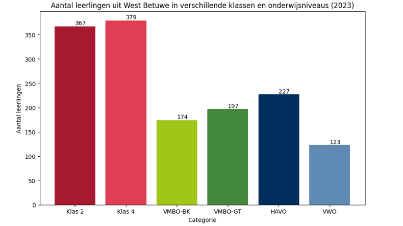 Middelengebruik onder scholieren is gemeten in de Gezondheidsmonitors op basis van deelnemende VO-scholen en postcode. Het kan dus voorkomen dat leerlingen uit West Betuwe naar scholen (buiten de gemeente) gaan die niet meedoen met de monitors. In 2023 hebben 753 leerlingen uit West Betuwe deelgenomen aan de Gezondheidsmonitor Jeugd, waarvan 367 leerlingen uit klas 2 en 379 leerlingen uit klas 4. In totaal volgden 174 leerlingen vmbo-bk, 197 leerlingen vmbo-gt, 227 leerlingen havo en 123 leerlingen vwo (zie ook figuur 1.1 op pagina 7).