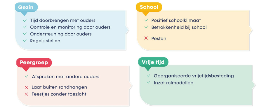 Hoewel de invloed van leeftijdgenoten en vrienden op het gedrag toeneemt naarmate kinderen vanaf de middelbare schoolleeftijd, blijven ouders invloed houden op het drinkgedrag van hun opgroeiende kind (Engels e.a., 2013; Smit e.a., 2020). Zij doen dat expliciet door de regels die ze stellen maar ook impliciet, bijvoorbeeld door hun eigen houding (positief of negatief) ten opzichte van alcohol en door hun eigen drinkgewoonten. Ouders die zelf regelmatig drinken, zijn bijvoorbeeld toleranter ten aanzien van alcoholgebruik bij hun kinderen (Engels e.a., 2013).