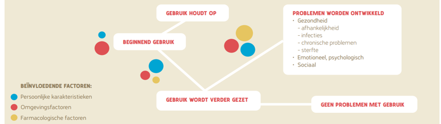 Het gebruik van alcohol, tabak en drugs is nooit zonder risico’s. Op de websites alcoholinfo.nl, rokeninfo.nl en drugsinfo.nl zijn de risico’s en de gevolgen van het gebruik van deze middelen beschreven. De verschillende middelen brengen ook verschillende risico’s met zich mee, zowel voor de gebruiker zelf als voor de omgeving. Voor de gebruiker zelf is er bijvoorbeeld een verhoogd risico op verschillende kankersoorten door roken/vapen of door het drinken van alcohol. Voor de omgeving vormt bijvoorbeeld het rijden onder invloed van alcohol of drugs een risico.