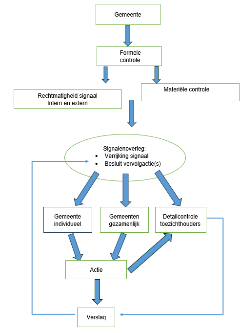Op het moment dat bij de detailcontrole, de ontbrekende informatie niet binnen de afgesproken tijd wordt ontvangen, wordt er in het signalenoverleg de vervolgstap besproken. De toezichthouders zullen de specifieke risicoanalyse, een specifiek controledoel en -controleplan opstellen en voorleggen aan de betrokken gemeenten.