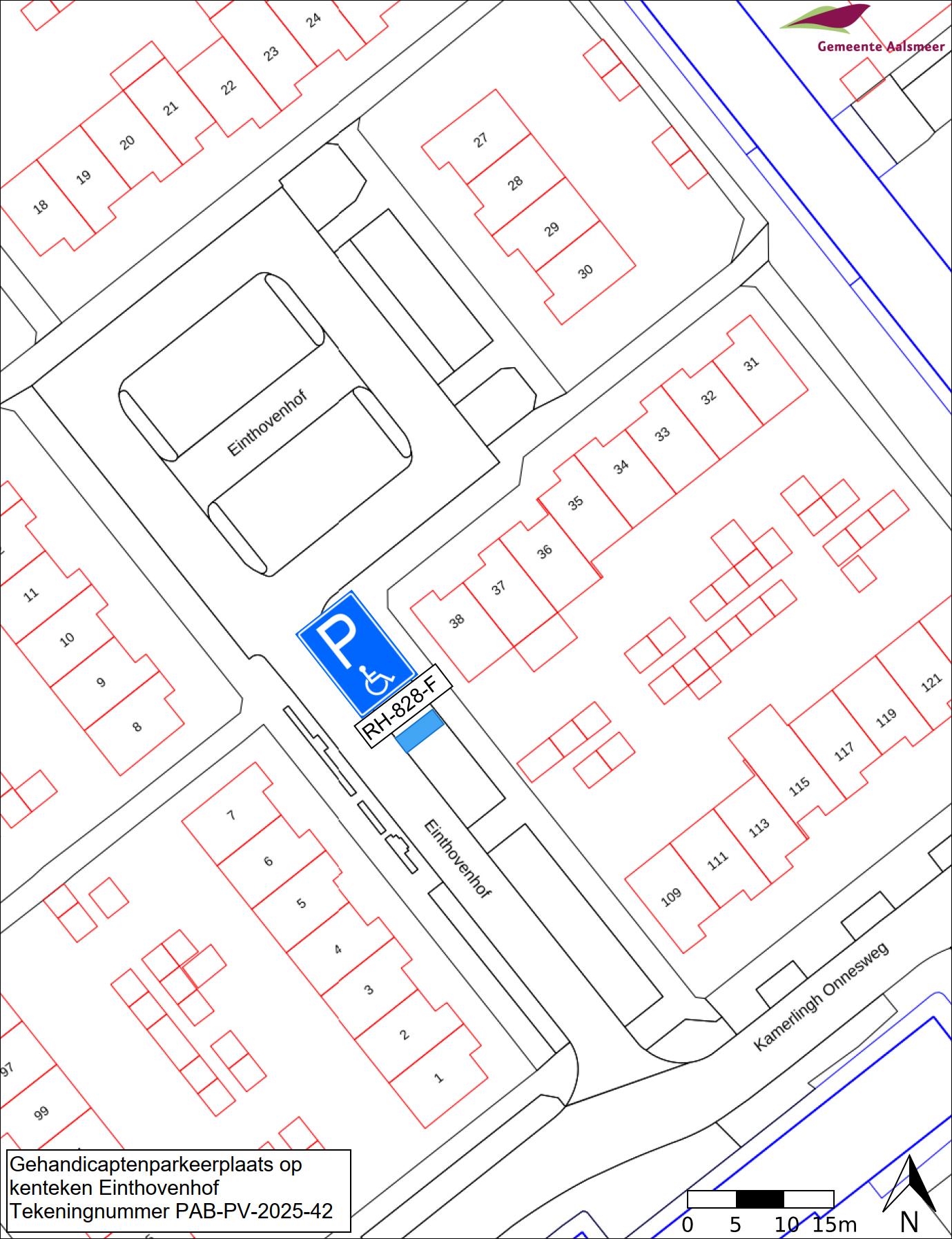 Burgemeester en wethouders van Aalsmeer besluiten het parkeren te verbieden op een parkeerplaats in de straat Einthovenhof, zoals aangegeven op tekening PAB-PV-2025-42, met uitzondering van het voertuig met het kenteken RH-828-F (gehandicaptenparkeerplaats).