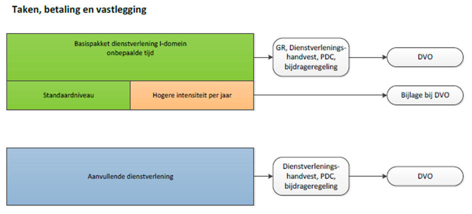 De afspraken over de I-dienstverlening kennen aldus een drieslag: type dienstverlening, betaling en vastlegging. In onderstaande visualisatie is dit uitgewerkt.