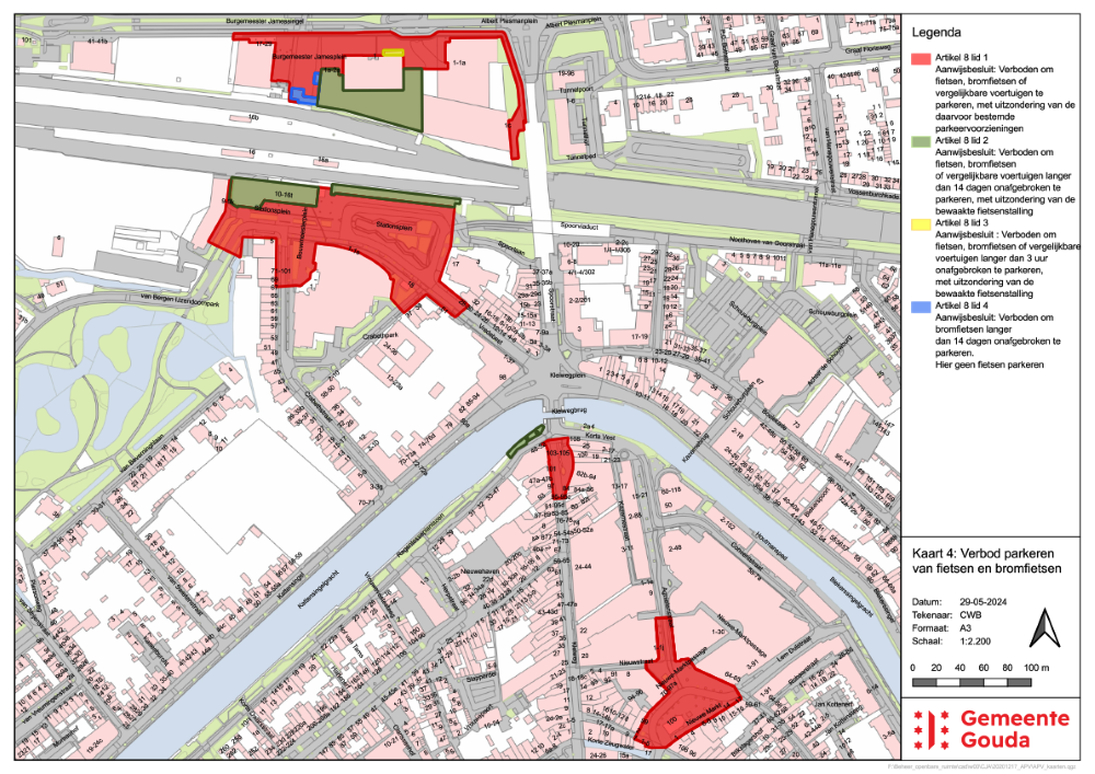 Dit artikel ziet op de aanwijzing van plaatsen waar fietsen, bromfietsen of vergelijkbare voertuigen voor maximaal een bepaalde periode of in het geheel niet mogen worden geparkeerd (behoudens in de aanwezige parkeervoorzieningen). Als op de aangewezen plaatsen voorzieningen zijn aangebracht of geplaatst, die bestemd zijn voor het parkeren van deze voertuigen, zoals fietsenrekken, goten of vakken, dan dienen de voertuigen in de voorzieningen te worden geplaatst. Het is niet toegestaan om de fietsen buiten de rekken te plaatsen. Voor meer informatie wordt verwezen naar de toelichting van artikel 5:6 e.v. van de APV Gouda 2025.