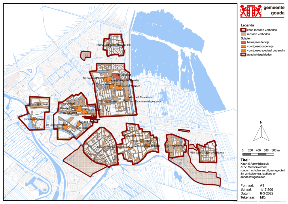 Kaart 5: Messenverbod rondom scholen en uitgaansgebied En winkelcentra, stations en aandachtsgebieden