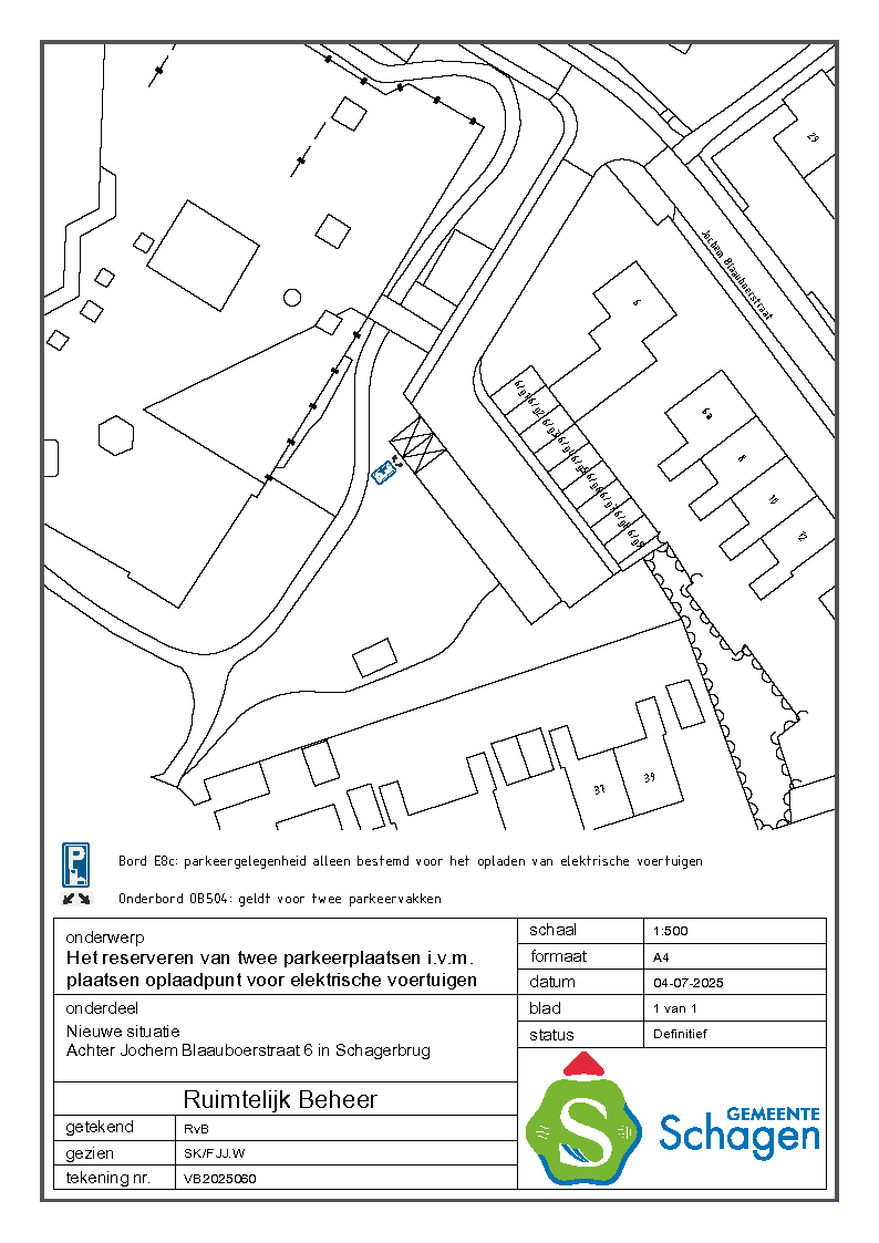 Gemeente Schagen- Verkeersbesluit reserveren van 2 parkeerplaatsen voor het opladen van elektrische voertuigen nabij Jochem Blaauboerstraat 6, Schagerbrug.
