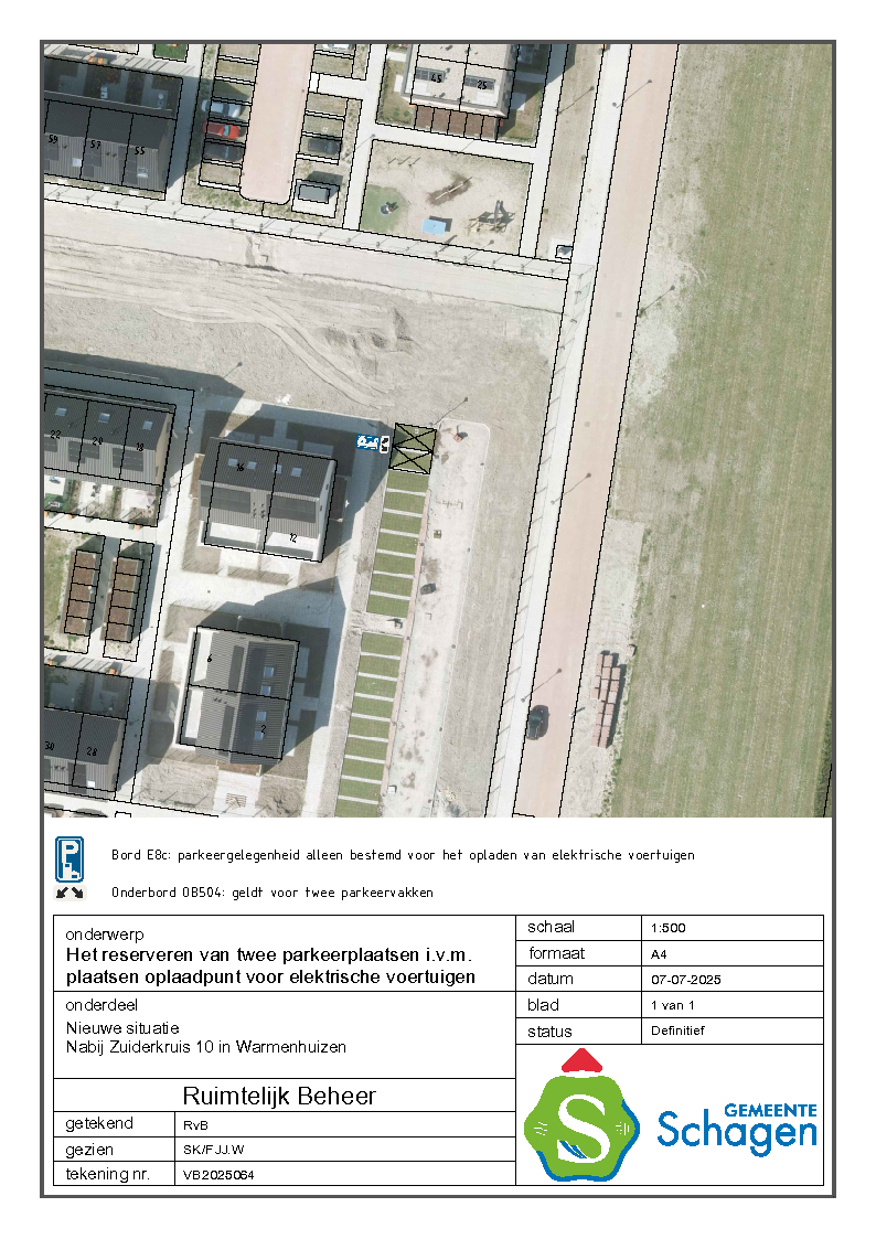 Gemeente Schagen- Verkeersbesluit reserveren van 2 parkeerplaatsen voor het opladen van elektrische voertuigen nabij Zuiderkruis 10, Warmenhuizen.