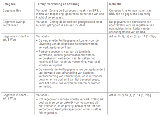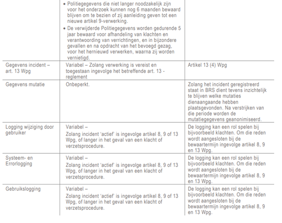 Politiegegevens worden niet langer bewaard dan de minimale tijd die nodig is, zoals vereist door de toepasselijke wet- en regelgeving, of voor de doeleinden waarvoor deze zijn verwerkt. Politiegegevens dienen na verwijdering nog maximaal vijf jaar worden bewaard. Daarna, of binnen deze periode van vijf jaar (afhankelijk van welke bewaartermijn geldt) dient definitieve vernietiging plaats te vinden. Indien van cultureel of historisch belang kan worden afgezien van vernietiging van de gegevens. Er wordt dan aan de bewaareisen als genoemd in de Archiefwet voldaan.
