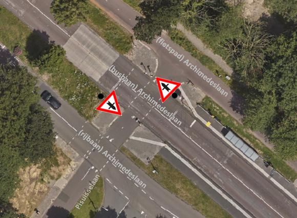 Archimedeslaan (op de busbaan vlak voor de kruising met het fietspad van de Pisuisselaan; wegvak in beide richtingen tussen Pythagoraslaan en Daltonlaan)
