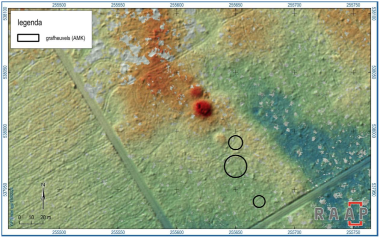 De terreinen van archeologische waarde (in de oude terminologie de AMK-terreinen) vormen een eigen categorie binnen Archis. Zij zijn op basis van ‘waarde’ onderverdeeld in vier categorieën: beschermde terreinen van zeer hoge archeologische waarde (dit zijn in de regel nu archeologische rijksmonumenten), terreinen van zeer hoge archeologische waarde, terreinen van hoge archeologische waarde en terreinen van archeologische waarde. Het gaat in de gemeente Emmen om 87 terreinen, waarvan 24 rijksmonumenten, 27 terreinen van zeer hoge archeologische waarde, 18 terreinen van hoge archeologische waarde en 18 terreinen van archeologische waarde. Ten opzichte van de oude kaart zijn drie nieuwe terreinen toegevoegd: het betreft drie grafheuvels waarvan de locatie is achterhaald op basis van hoogtekaarten (AHN4). Hoewel dit geen officiële ‘AMK-terreinen’ zijn, wordt aanbevolen er terreinen van hoge archeologische waarde van te maken conform nabijgelegen andere grafheuvels. Daarnaast is van een tiental grafheuvels (rijksmonumenten en terreinen van zeer hoge en hoge archeologische waarde) de geometrie aangepast dan wel verplaatst. Uit een handmatige controle van al deze terreinen met behulp van het AHN4 bleek namelijk dat het te beschermen terrein in werkelijkheid naast de daadwerkelijke heuvel lag (figuur 3). Helaas wordt Archis voor wat de terreinen van archeologische waarde betreft, niet meer onderhouden/up to date gehouden. Dat betekent dat de geometrieën alleen voor deze kaart zijn aangepast, en dat terreinen volgens ARCHIS nog gewoon blijven bestaan, ook als aangetoond is dat zij op die locaties geen bestaansrecht hebben.