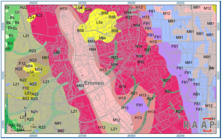 Op verzoek van de gemeente is voor het veengebied in het oosten en zuiden van de gemeente Emmen (geomorfologische eenheden ‘ontgonnen veenvlakte’ en ‘veenkoloniale ontginningsvlakte’) verder onderscheid gemaakt op basis van de landelijke bodemkaart (1:50.000). Zodoende wordt voorkomen dat te grote gebieden op basis van een geomorfologische typering worden vrijgegeven. Op de landschapskaart is daarom van beide voorgenoemde geomorfologische eenheden een opsplitsing gemaakt op basis van bodemtype, waarna de voor archeologische resten en (kortstondige) bewoning meest geschikte veengronden als bodemkundige eenheden in de landschapskaart zijn verwerkt. Het gaat daarbij om: veldpodzolgronden (Hn21, Hn23), veengronden met een veenkoloniaal dek op zand met humuspodzol (iVp), moerige podzolgronden (iWp, vWp, zWp), moerige eerdgronden (iWz, vWz, zWz), meerveengronden op zand (zVp, zVz) en vlierveengronden op zand met humuspodzol (Vp).