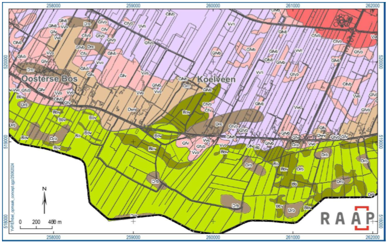 In de beekdalen zijn ten opzichte van de oude kaart wel veel verschillen waarneembaar, waaronder die van het Schoonebeekerdiep in het uiterste zuiden van de gemeente (vergelijk figuren 9 en 10). Niet zozeer omdat op de nieuwe geomorfologische kaart daar meer detail is aangebracht, maar omdat met behulp van het AHN de dekzandkoppen en -ruggen in en langs het beekdal (Bk) in kaart zijn gebracht.