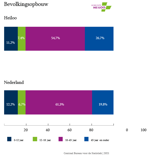 In Heiloo is de leeftijdsgroep 45-65 jaar eveneens het grootst. Verder is de groep 65 plus groot en wonen er gezinnen met jonge kinderen.