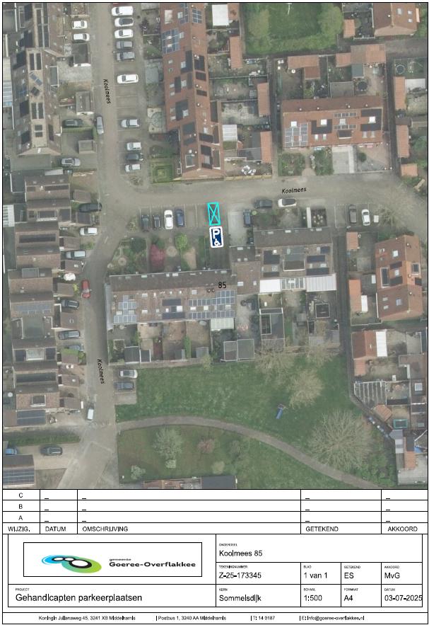 tot het aanwijzen van een gehandicaptenparkeerplaats op kenteken in de Koolmees, in de haakse parkeervakken tegenover de woning met huisnummer 85 te Sommelsdijk, door het plaatsen van verkeersbord E06 met onderbord OB309 met daarop het kenteken van de aanvrager conform model van bijlage I van het Reglement Verkeersregels en Verkeerstekens 1990;