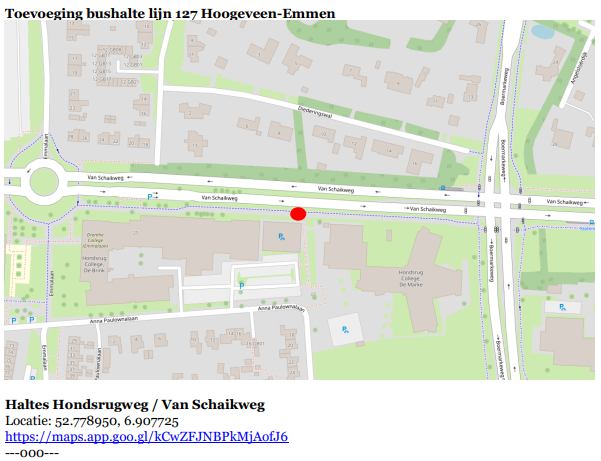 Bushaltes zijn essentieel in het laten functioneren van het openbaar vervoer. Op 25 augustus 2025 gaat de nieuwe buslijn 127 Emmen-Hoogeveen van start. Vanwege de start van deze lijn gaan er meer bussen rijden over de Van Schaikweg en is het nodig een nieuwe bushalte te plaatsen zodat passagiers er in en uit kunnen stappen. Deze ontwikkeling kan een wijziging in het reizigersaanbod teweegbrengen.