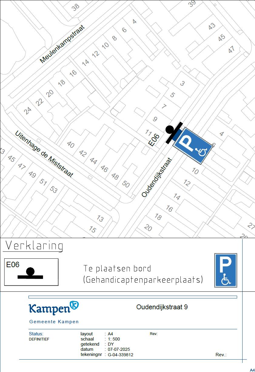 - nabij de Oudendijkstraat 9 in Kampen één openbare parkeerplaats aan te wijzen als gehandicaptenparkeerplaats op kenteken door het plaatsen van een verkeersbord conform het model E6 van bijlage 1 RVV 1990 inclusief onderbord met het kenteken van het voertuig;