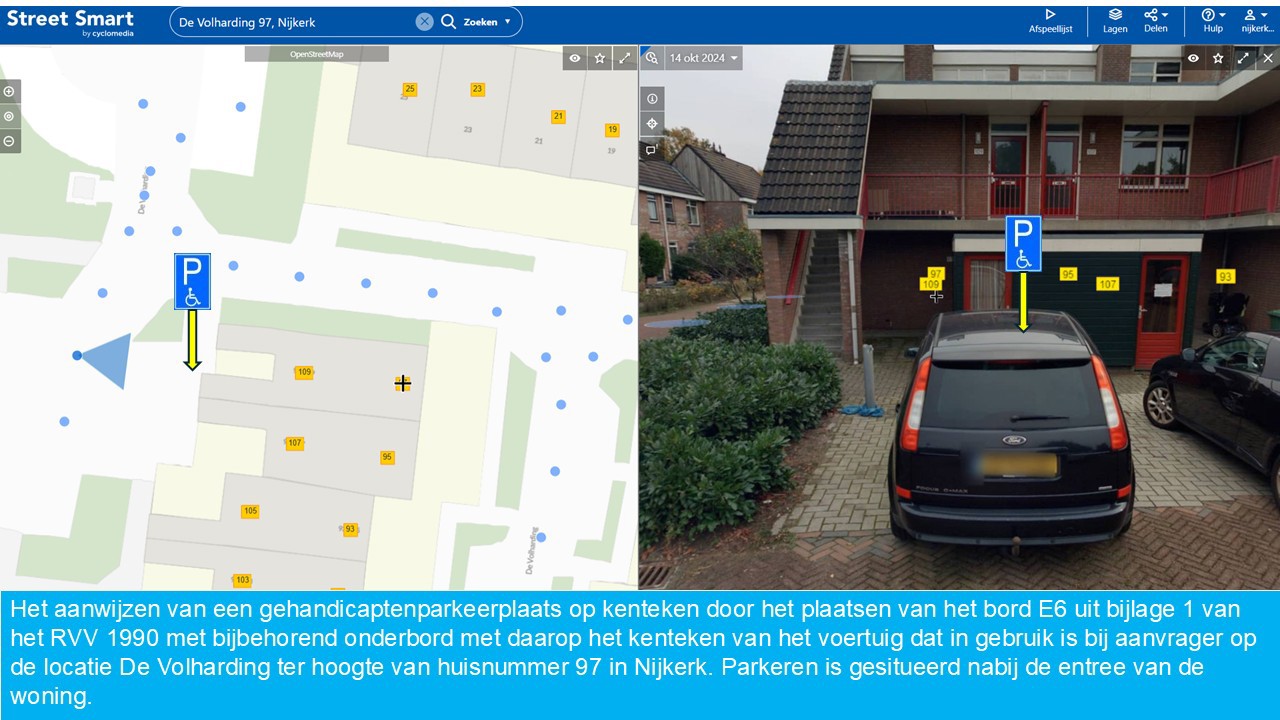 Het aanwijzen van een gehandicaptenparkeerplaats op kenteken door het plaatsen van het bord E6 uit bijlage 1 van het RVV 1990 met bijbehorend onderbord met daarop het kenteken van het voertuig dat in gebruik is bij aanvrager op de locatie De Volharding ter hoogte van huisnummer 97 in Nijkerk;