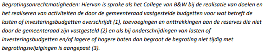 Bij de rechtmatigheidscontrole vormt het begrotingscriterium een belangrijk toetsingscriterium. In de toelichting op het Bado (Besluit accountantscontrole decentrale overheden) wordt begrotingsrechtmatigheid omschreven als (versie geldend november 2024):