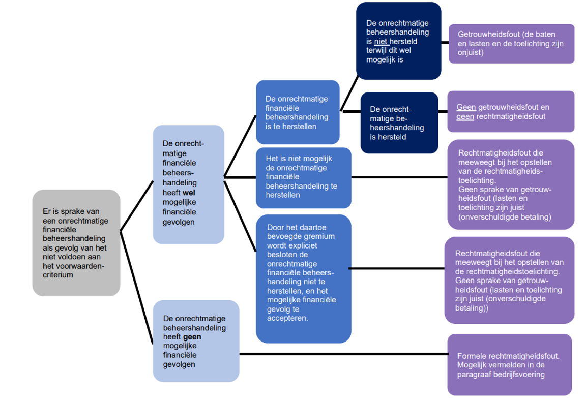 Een verklaring geven voor de geconstateerde onrechtmatigheden. Er kunnen bijvoorbeeld redenen zijn waarom er afgeweken is van een voorschrift in een regeling. Redenen die wellicht ook al eerder besproken zijn met de Raad. Ook als de rechtmatigheidsfouten lager zijn dan de door de raad vastgestelde verantwoordingsgrens kunnen in de paragraaf bedrijfsvoering de wel geconstateerde rechtmatigheidsfouten worden vermeld. Dit kan verstandig zijn voor de rechtmatigheidsfouten die de accountant op basis van afspraken tussen de raad en accountant in het verslag van bevindingen zal opnemen.