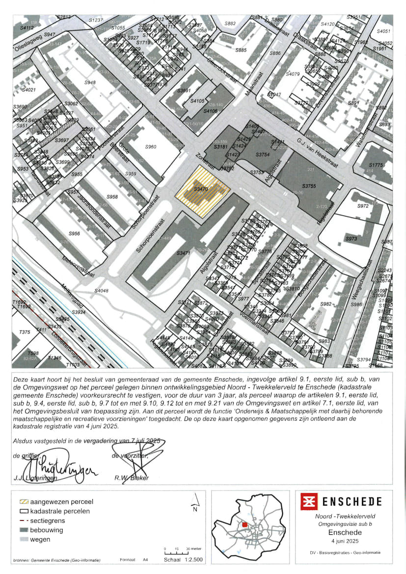 De gemeenteraad van de gemeente Enschede maakt op grond van artikelen 9.1, eerste lid, 9.4, eerste lid, 9.7 tot en met 9.10, 9.12 tot en met 9.21 Omgevingswet en artikel 7.1, eerste lid Omgevingsbesluit bekend dat zij op 7 juli 2025 besloten heeft ingevolge de Omgevingswet en het Omgevingsbesluit op het perceel gelegen binnen het Ontwikkelingsgebied Noord – Twekkelerveld (op basis van artikel 9.1, eerste lid en 9.4, eerste lid van de Omgevingswet) een voorkeursrecht te vestigen. Met een dergelijke aanwijzing (het vestigen van een voorkeursrecht) wordt een voorkeursrecht op het betrokken perceel gevestigd voor een periode van drie jaren.