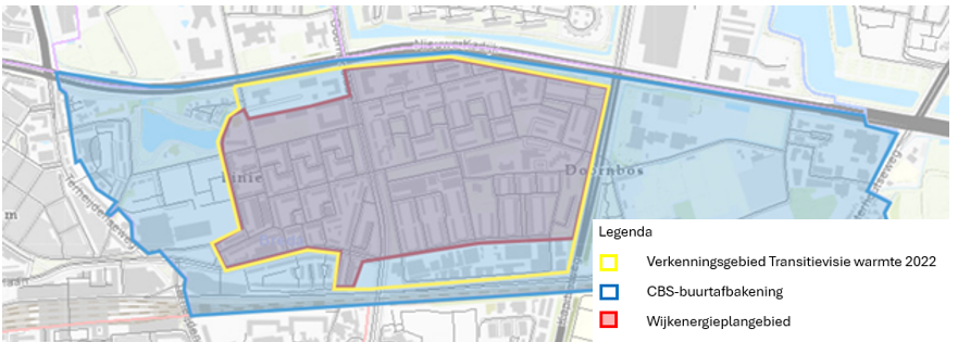 De CBS-buurtafbakening van Doornbos-Linie is in afbeelding 3.1 weergegeven in blauw. In de Transitievisie Warmte 2022 is gekozen voor een verkenningsgebied conform de gele lijn. Het uiteindelijke wijkenergieplangebied is weergegeven in rood.