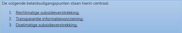 Dit beleid dient als ondersteuning voor het onderdeel subsidies en moet ertoe leiden dat de structuur, systematiek en proces voor subsidies wordt verbeterd.