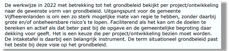 Wij kiezen voor een “situationeel grondbeleid”. De Programmabegroting 2022-2025 formuleert en motiveert deze keuze reeds goed en bondig: