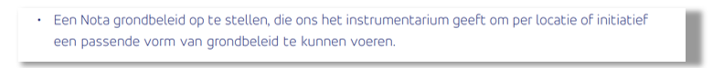 Integraal overzicht: Grondbeleid is instrumenteel van aard. Dit betekent dat gemeenten een gereedschapskist hebben met financiële en juridische instrumenten. In deze nota maken wij onderbouwde keuzes over hoe wij die instrumenten inzetten. De instrumenten zelf zijn vaak complex en specialistisch van aard en worden daarom waar nodig nader toegelicht. Op deze wijze ontstaat een integraal en afgewogen overzicht van het beschikbare instrumentarium