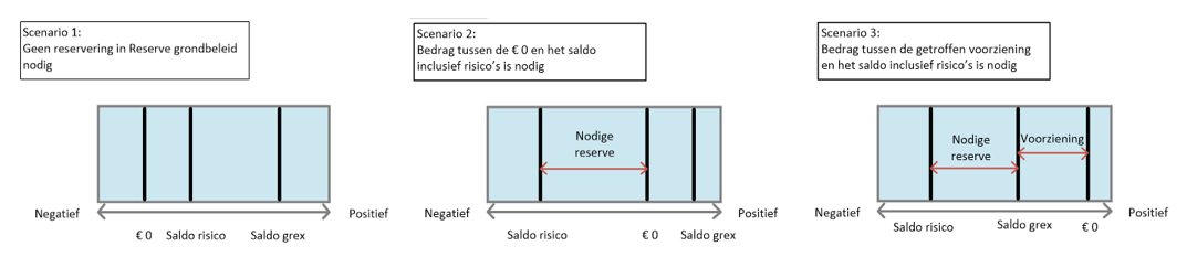 Voor elke lopende grondexploitatie wordt jaarlijks een risicoanalyse uitgevoerd waarbij de risico’s voor de grondexploitatie worden geïnventariseerd en gekwantificeerd. Als een grondexploitatie nog steeds een positief saldo kent in het geval dat alle geïnventariseerde risico’s zich voordoen, is voor die grondexploitatie geen risicoreservering in de ARG nodig. Pas als een grondexploitatie negatief wordt, is voor dat gedeelte een reservering nodig. Als een grondexploitatie al een negatief saldo kent, dan treffen wij daar een voorziening voor (zie paragraaf 5.4). Als uit de risicoanalyse blijkt dat het saldo nog negatiever kan worden, dan wordt een reservering getroffen ter grootte van dit verschil. Onderstaande figuur maakt een en ander duidelijk.