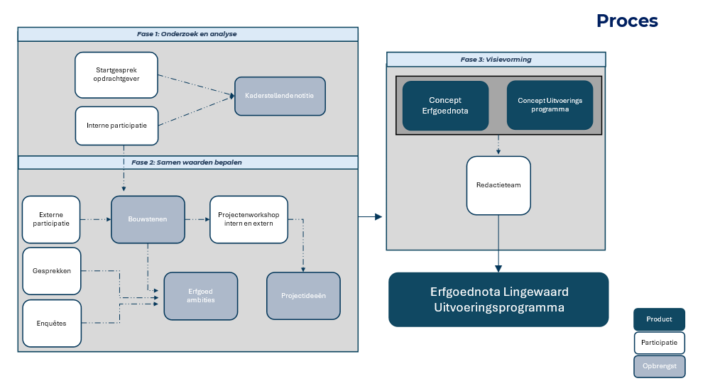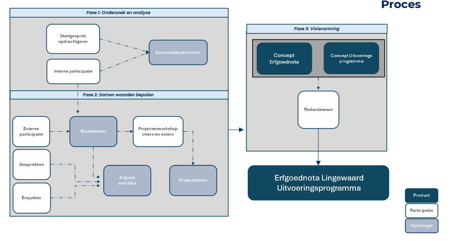 De ambities in deze nota zijn het resultaat van een breed participatieproces waarin de stem van Lingewaarders centraal stond. Dit proces heeft geleid tot de bouwstenen waarop de inhoud van dit erfgoedbeleid is gebaseerd en de acties in het uitvoeringsprogramma zijn gevormd.