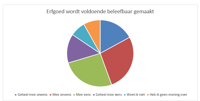 Een kleine meerderheid van de respondenten vond dat erfgoed onvoldoende beleefbaar wordt gemaakt. Hierbij wordt de toelichting gemaakt dat erfgoedbeleving voornamelijk vanuit initiatief van de gemeente gebeurt. Er is behoefte aan meer communicatie zodat de inwoners op de hoogte zijn van de plannen en initiatieven. Aan de andere kant uitten de respondenten tevredenheid met de huidige stand van zaken. Er wordt veel gedaan en de mensen zijn trots op het zichtbare erfgoed.