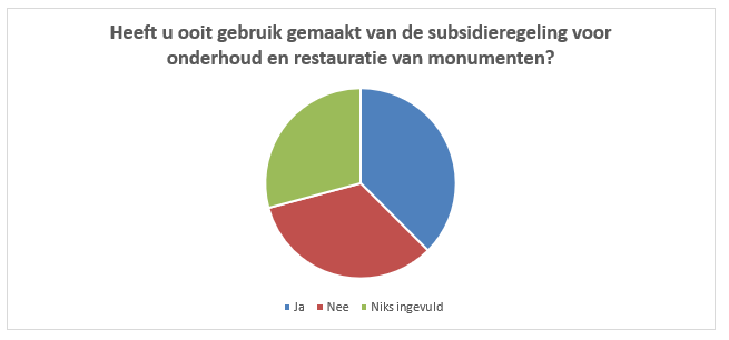 De gemeentelijke monumenteneigenaren zijn separaat bevraagd over hun persoonlijke ervaringen en bevindingen. Opvallend is dat 62,50% van de respondenten bekend is met de subsidieregeling voor het onderhoud en restauratie van het monument. Ca. 1/3e van de respondenten heeft gebruik gemaakt van de subsidieregeling, waarvan de meeste ervaringen negatief waren. Het wordt doorgaans omschreven als een niet makkelijk en omslachtig proces.