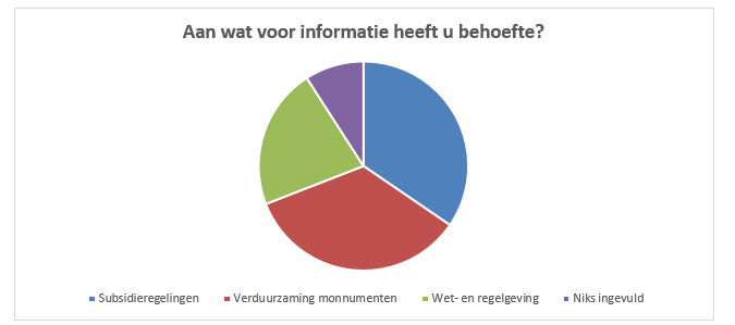 Uit de enquête kan opgemaakt worden dat de meeste monumenteneigenaren behoefte heeft aan meer informatie vanuit de gemeente. Dit blijkt uit de vraag “Aan wat voor informatie heeft u behoefte?”, waar 19 van de 24 respondenten minstens één van de drie onderdelen had aangevinkt. De meeste respondenten gaven aan meer behoefte te hebben aan informatie omtrent subsidieregelingen en verduurzaming van monumenten.
