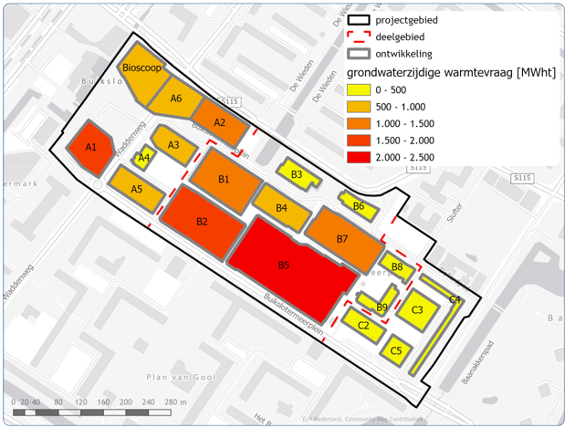 Op basis van de ontwikkelvelden zijn de gebouwzijdige energievraag en benodigde vermogens per blok bepaald. Op basis van deze energievraag en vermogens is met behulp van kentallen, energetische uitgangspunten en de jaarlijkse verdeling van vermogens de bodemzijdige vraag bepaald. In Figuur 4.2 is de verwachte bodemzijdige warmtevraag weergegeven per ontwikkelveld. In Tabel 4.1