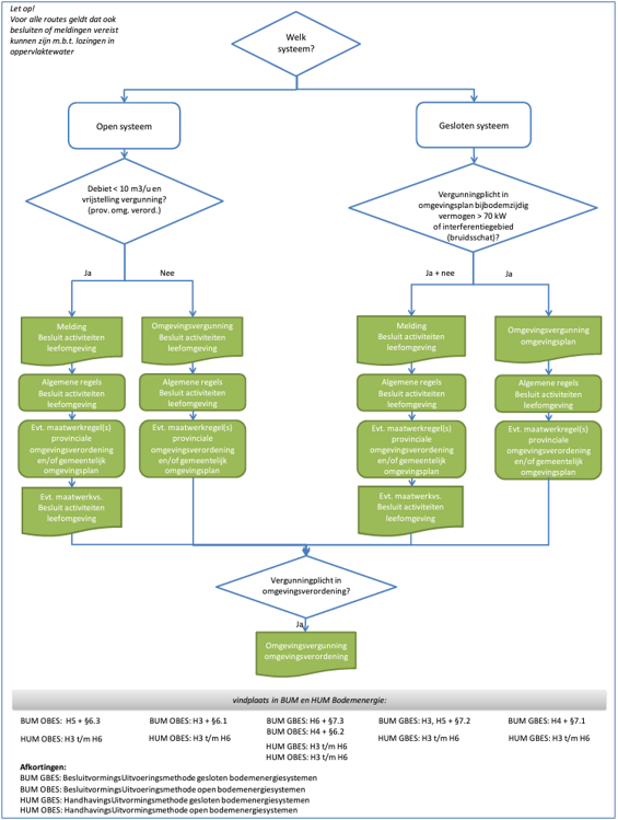 De aanleg en bedrijfsvoering van bodemenergiesystemen raakt aan diverse belangen, zoals milieu, drinkwater, bodemkwaliteit, etc. Voor de aanleg ervan is daarom altijd een melding of een omgevingsvergunning vereist in het kader van de Omgevingswet (zie Bijlage 2). Ook gelden specifieke procedures. In Bijlage 3 volgt een beknopte beschrijving van de te volgen procedures en vergunningsplichten bij de aanleg van een open en een gesloten bodemenergiesysteem. Daarna volgt ook een kort overzicht van de regels die gelden voor lozingsactiviteiten. Steeds is hierbij ook aangegeven welk orgaan het bevoegd gezag is.