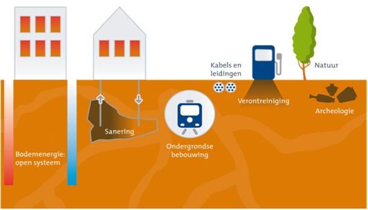 Bij grootschalige toepassing van bodemenergie neemt de drukte in de ondergrond sterk toe. Voorkomen moet worden dat bij een toename van het aantal bodemenergiesystemen negatieve interferentie tussen bodemenergiesystemen onderling of nadelige beïnvloeding van andere ondergrondse functies optreedt (Figuur 1.2).