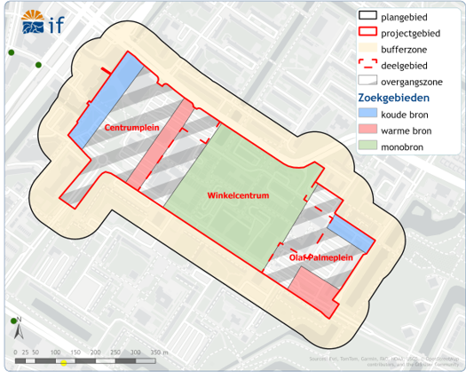 De afstanden tussen de stroken en de oriëntatie van de stroken zijn bepaald op basis van de te verwachten waterverplaatsingen binnen de deelgebieden. Binnen het warme zoekgebied in het deelgebied Olof Palmeplein wordt een busplatform gerealiseerd. De exacte ligging hiervan is nog niet bekend. Mogelijk dat een deel van het zoekgebied hierdoor niet geschikt zal zijn voor het plaatsen van bronnen. Omdat in dit zoekgebied, bij een collectief systeem voor dit deelgebied, maar één warme bron gerealiseerd hoeft te worden, is de verwachting dat er binnen het zoekgebied, ook wanneer een deel wegvalt, mogelijkheden blijven om een bron te plaatsen.