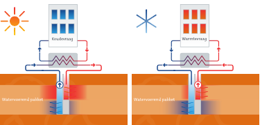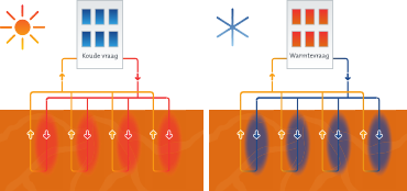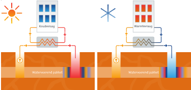 Bij een opslagsysteem wordt de warmte en koude opgeslagen bij de bronnen. Eén bron is de zogenoemde warme bron, de andere bron de koude bron. Deze bronnen onttrekken en infiltreren afwisselend, afhankelijk van het seizoen. Een recirculatiesysteem is een alternatief systeem dat bestaat uit een onttrekkings- en een infiltratiebron. Er is geen sprake van opslag. Er wordt namelijk continu grondwater onttrokken uit de ene bron en geïnfiltreerd in de andere bron. Met het onttrokken grondwater, met een temperatuur gelijk aan de natuurlijke grondwatertemperatuur, wordt in de zomer gekoeld en in de winter verwarmd.