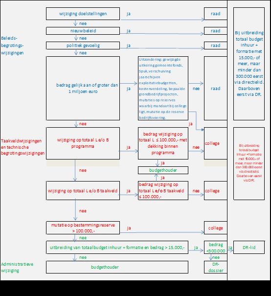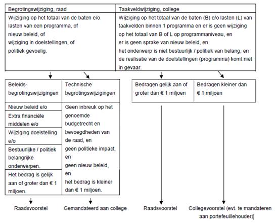 In het volgende schema is het onderscheid tussen begrotingswijzigingen (raadsbevoegdheid) en taakveldwijzigingen weergegeven (collegebevoegdheid) en welke begrotingswijzigingen te mandateren zijn aan het college van burgemeester en wethouders.