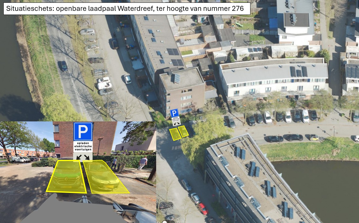 om op Waterdreef of ter hoogte van Waterjuffer 276 twee parkeervakken gelegen bij het oplaadpunt voor elektrische voertuigen aan te wijzen als parkeerplaats voor het opladen van elektrische voertuigen, volgens de bijlage bij dit besluit;