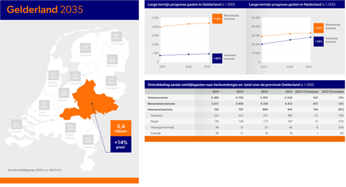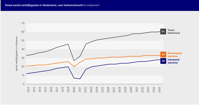 De Nederlandse vrijetijdssector is volop in ontwikkeling. Het inkomend toerisme groeide de afgelopen 10 jaar met gemiddeld 5% per jaar. Forecast 2035 (de prognose van het verblijfstoerisme in Nederland tot en met 2035 opgesteld door het Nederlands Bureau voor Toerisme en Congressen (NBTC) en het Centre of Expertise Leisure, Tourism and Hospitality (CELTH) verwachten in 2035 in totaal 61 miljoen verblijfsgasten in Nederland. Ten opzichte van 2023 is dit een groei van 12 miljoen gasten, ofwel 24 procent. Gemiddeld gaat het om een groei van 1 miljoen gasten per jaar. Het aantal internationale aankomsten in 2035 wordt geschat op 28 miljoen (+39% t.o.v. 2023). Het aantal verblijfsgasten uit eigen land groeit met 13 procent naar 33 miljoen.
