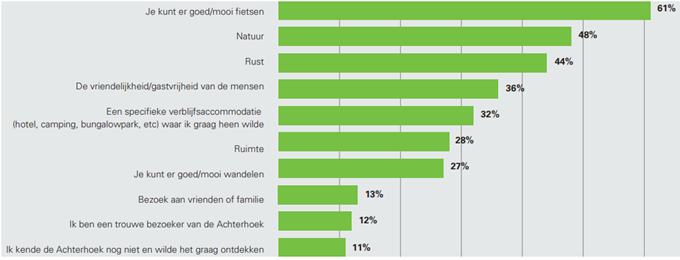 De respondenten die voor de Achterhoek gekozen hebben, konden aangeven wat de redenen (max. 5 antwoorden) waren voor de keuze voor deze regio. Belangrijkste redenen zijn de goede/mooie fietsmogelijkheden en de natuur. Ook de rust, de aanwezigheid van een specifieke accommodatie en de vriendelijkheid en gastvrijheid van de bevolking.