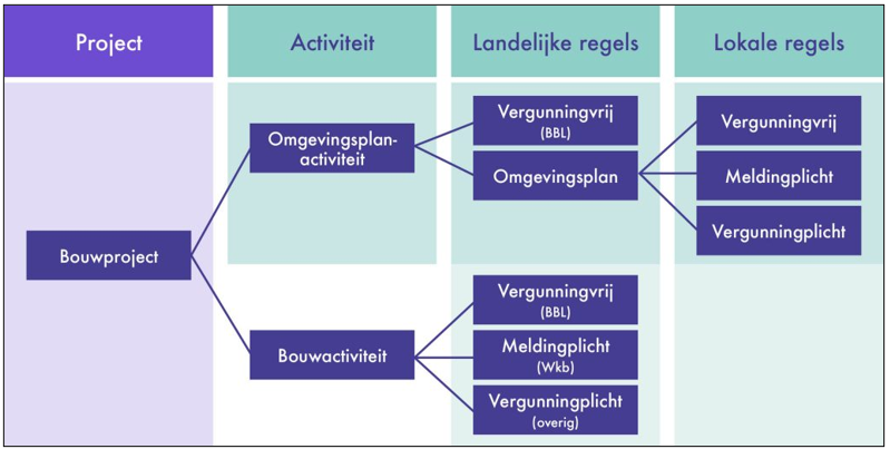 De ruimtelijke regels en de regels voor de ruimtelijke kwaliteit (redelijke eisen van welstand) worden vastgelegd in het omgevingsplan. Het bouwen als ruimtelijke activiteit heet de omgevingsplanactiviteit (OPA) wanneer de activiteit in het omgevingsplan past of buitenplanse omgevingsactiviteit (BOPA) wanneer de activiteit niet in het omgevingsplan past. In het Besluit bouwwerken leefomgeving (hierna: Bbl, de opvolger van het Bouwbesluit 2012) staan de regels voor het bouwtechnische deel van de bouwactiviteit en of er een vergunning nodig is. Bij bouwen onder kwaliteitsborging is voor het bouwtechnische gedeelte van de activiteit een meldingsplicht ingevoerd.