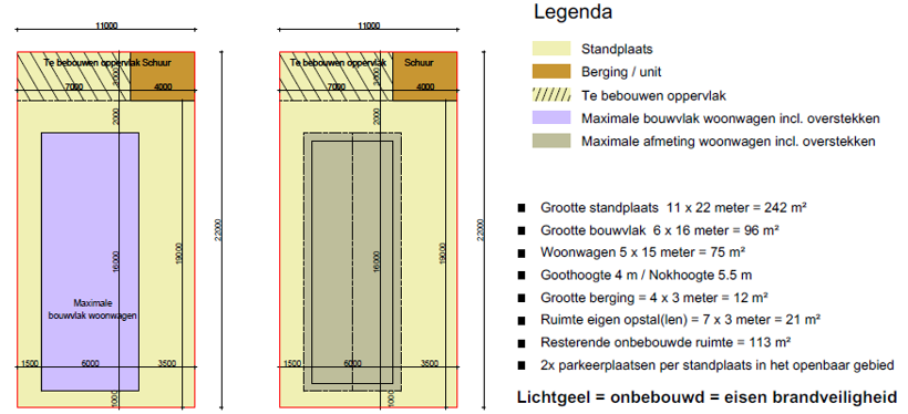 Voorbeeld van maatvoering kooptandplaats + eigen woonwagen in relatie tot en brandveiligheidsregels