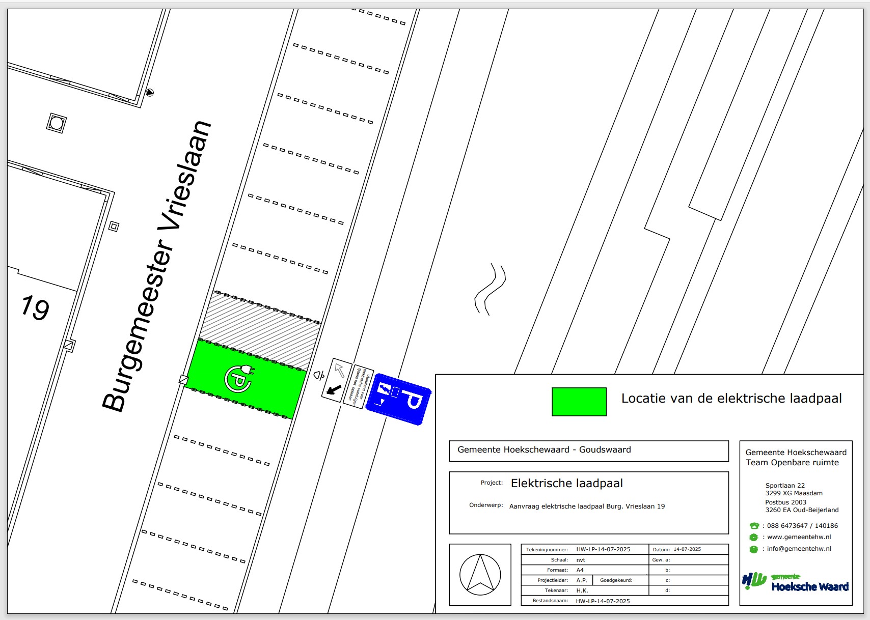 Twee parkeerplaatsen aan te wijzen voor het uitsluitend opladen van elektrische voertuigen, waarbij aanvankelijk slechts één parkeerplaats wordt geëffectueerd. Dit door middel van het plaatsen van het bord E8c van het RVV (Reglement Verkeersregels en Verkeerstekens 1990) voorzien van het onderbord met de tekst ” Uitsluitend voor elektrische voertuigen tijdens het opladen”.