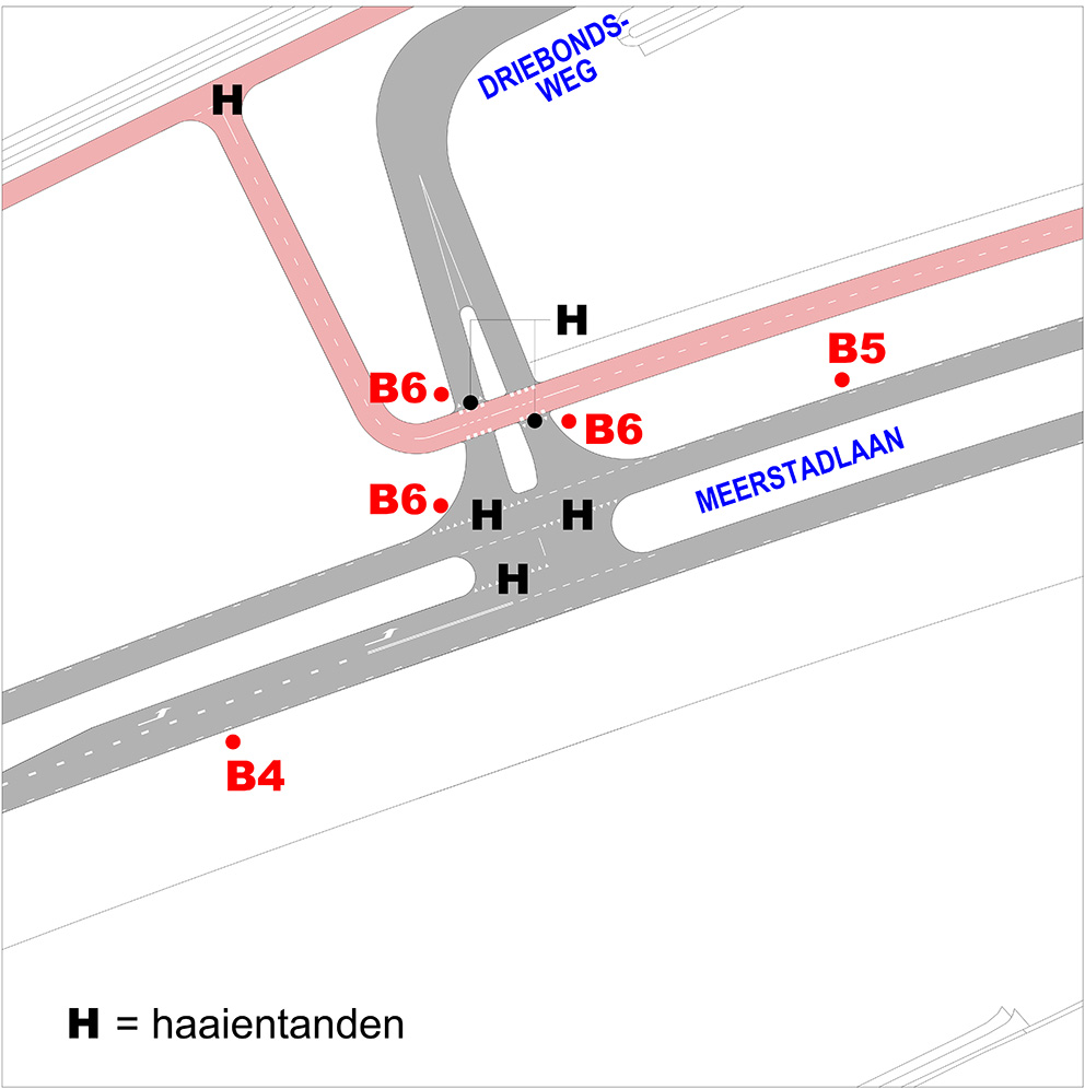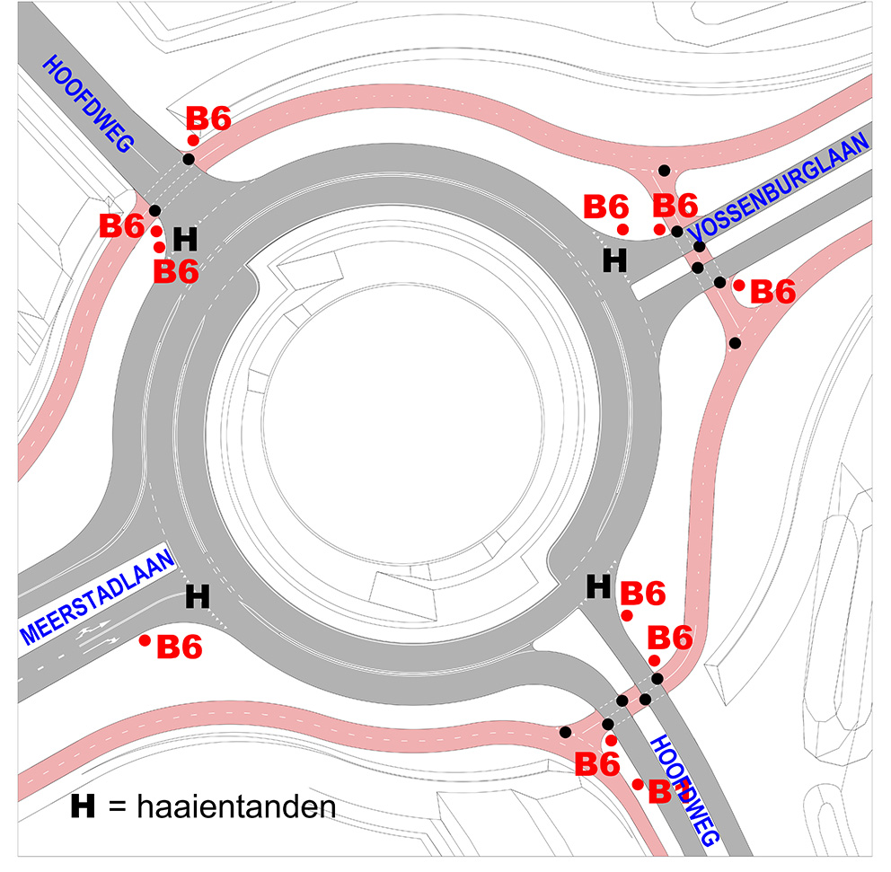 De rotonde op de kruising Meerstadlaan/Vossenburglaan/Hoofdweg ligt buiten de bebouwde kom. Conform de richtlijnen is de (brom)fietser uit de voorrang gehaald met de daarbij behorende vormgeving van de oversteken.