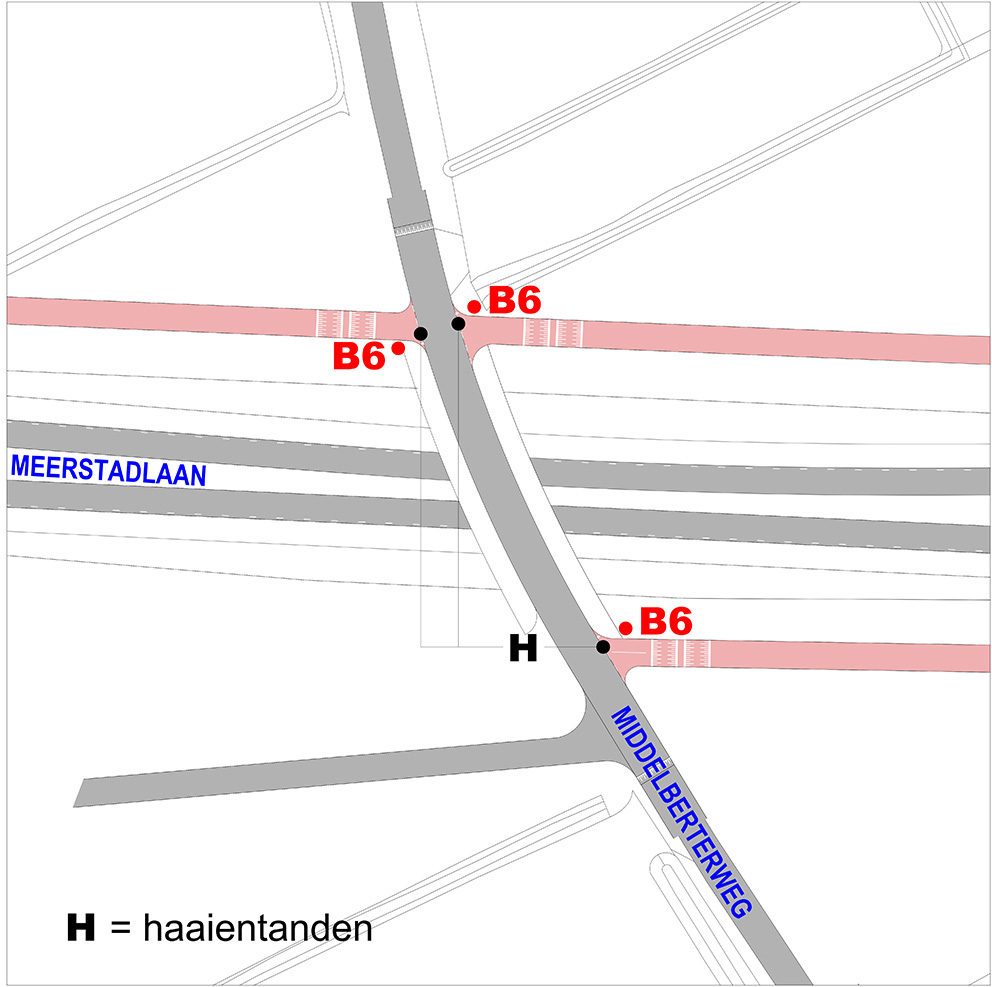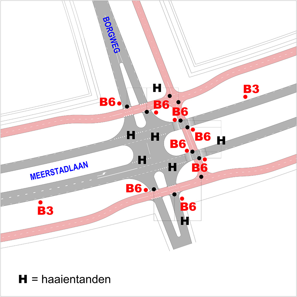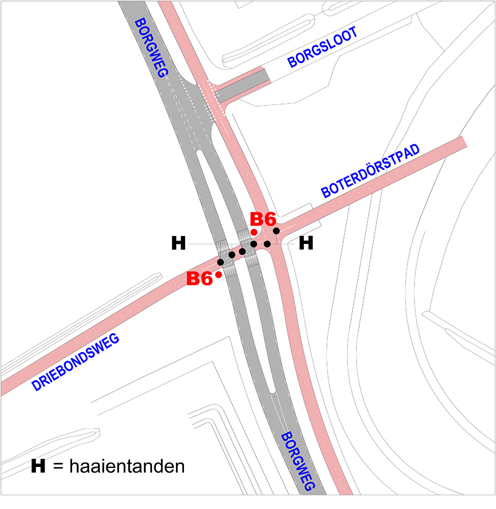 Omwille van de veiligheid heeft het verkeer op de Borgweg en Middelberterweg voorrang op fietsers op de kruisende (solitaire) fietspaden.