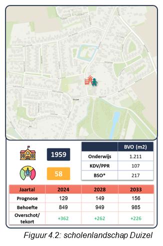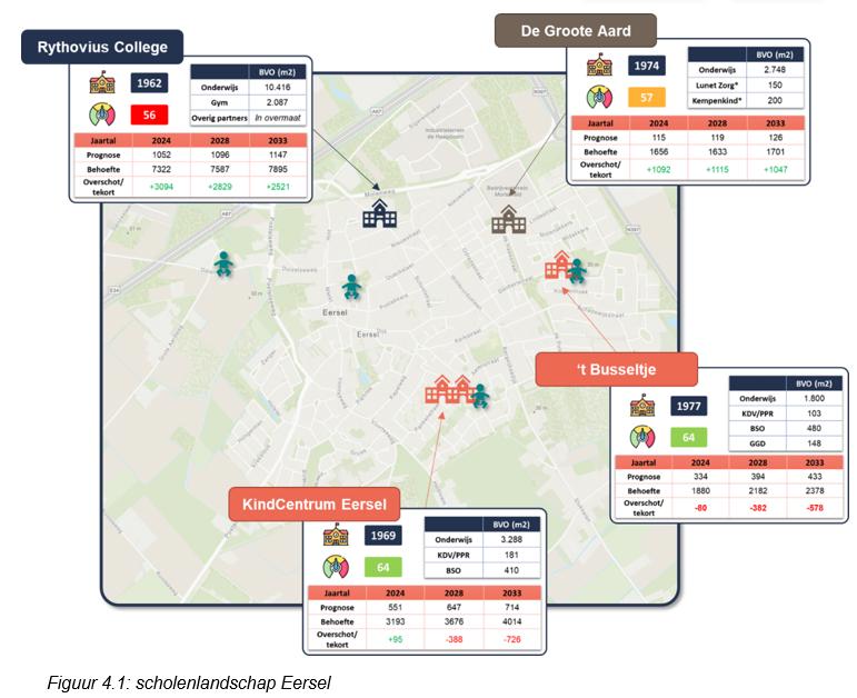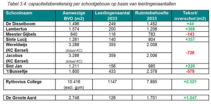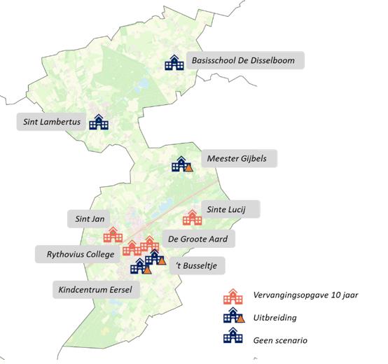 Uitbreidingsopgave: richting 2033 wordt bij ’t Busseltje, Kindcentrum Eersel (Wereldwijs en Jacobus) en Meester Gijbels een normatief ruimtetekort verwacht van meer dan 90 m². Deze scholen hebben daarmee recht op structurele uitbreiding. Ten behoeve van de uitbreidingsvragen wordt in het voorliggende IHP rekening gehouden met: nieuwe school kern Eersel, nieuwe gymzaal kern Eersel en uitbreiding door middel van verdieping op Meester Gijbels.
