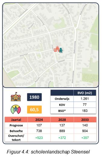 In de kern Steensel is basisschool SinteLucij gevestigd. Sinte Lucij is oorspronkelijk gebouwd in 1980. In 2002 en 2013 hebben er renovaties plaatsgevonden die niet levensduurverlengend waren. In het gebouw zit naast de school nog een kinderopvangorganisatie. Kwalitatief gezien is het gebouw toe aan vernieuwing. Kwantitatief gezien heeft de school momenteel een ruimteoverschot. Door middel van de SUVIS-regeling is het binnenmilieu deels aangepakt (wat heeft geleid tot een hogere score in de quickscan). Een deel van de investering dient nog gedaan te worden en is geparkeerd in afwachting van het IHP. In 2020 is een principeakkoord gegeven op de levensverlengende renovatie van Sinte Lucij. In dit akkoord is opgenomen dat de renovatie in het eerstvolgende IHP wordt ingebracht.